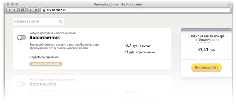 Если у вас есть возможность выйти в интернет, то для управления списком добавленных платных опций логичнее будет воспользоваться личным кабинетом абонента Билайн, который доступен по адресу my.beeline.ru.