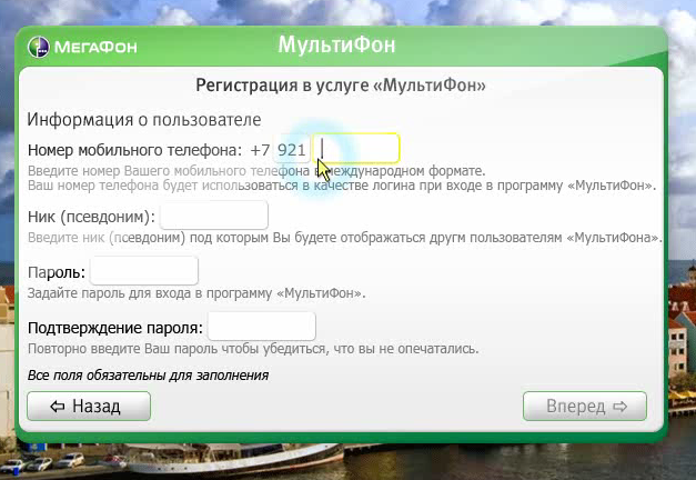 При регистрации через интерфейс программы либо через онлайн форму потребуется ввести номер телефона действующего абонента Мегафон.