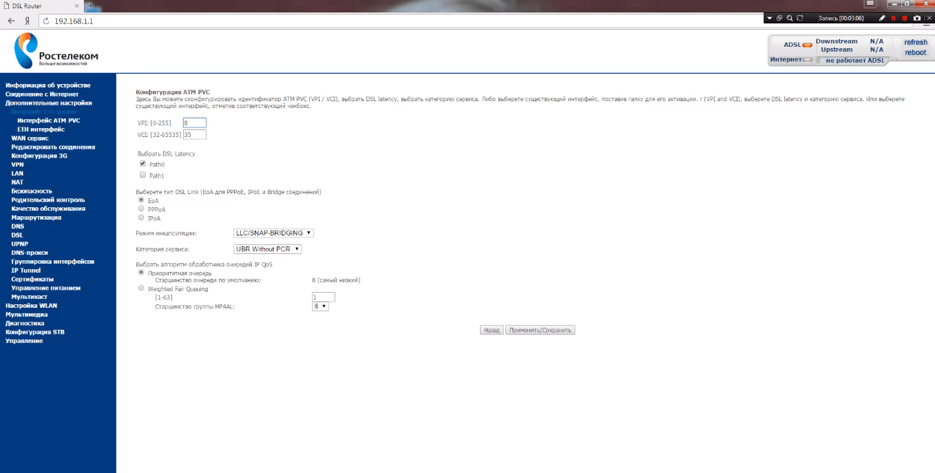 Для окончания процесса настройки, подключения интернета и окончательной настройки Wi-Fi маршрутизатора f st 2804 v7 rev 1, переходим во вкладку «Дополнительные», где в разделе WAN сервис придется избавиться от всех существующих подключений. Удаляется подобным образом и ненужная уже информация из раздела «Интерфейс 2-го уровня». После нажатия на кнопку «Добавить» мастер настройки оборудования Sagemcom f st 2804 предложит ввести VCI и VPI данные, а они отличаются, в зависимости от вашего местоположения. Действенную помощь всегда окажут в службе техподдержки «РТК». Применяем и сохраняем настройки, после чего во вкладке WAN-сервис добавляем только что созданное подключение и указываем его тип (стандартно PPPoE).