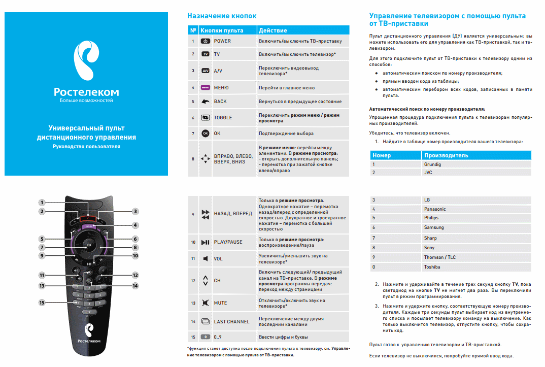 В том случае, если не работает пульт Ростелеком, и вы не знаете, что делать, посмотрите на модель вашего телевизора. Может случиться так, что модели вашего телеприемника нет в списке предустановленных, поэтому настраивать ПДУ придется в ручном режиме, а для этого используются специальные коды, отличающиеся у каждого производителя. В таблице кодов надо найти код своего телевизора, войти в режим программирования (комбинация кнопок OK и TV) и ввести найденную комбинацию цифр. Если это не помогла, откатываем устройство до заводских настроек и пробуем вводить другие коды.